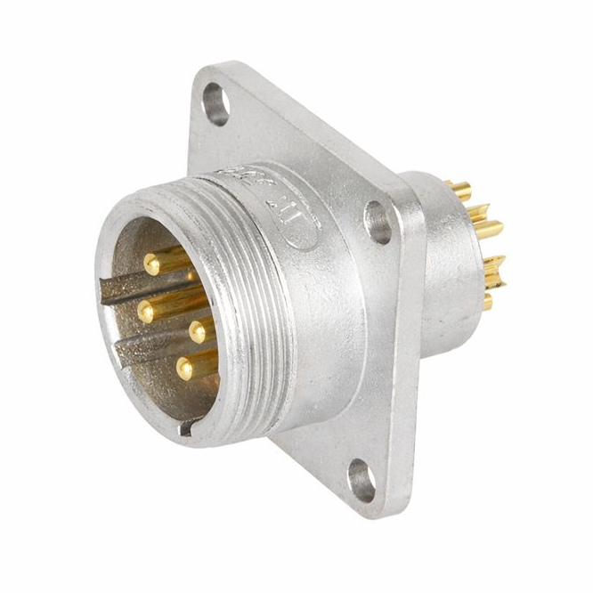 ROUND MALE CONNECTOR 4 WAY,FLANGE MOUNT WITH GASKETS, 10A, 250VAC SQU=29MM, PUSH ON TYPE MATES WITH M595711C TO MAKE IN LINE & PANEL MOUNT CONNECTOR SET