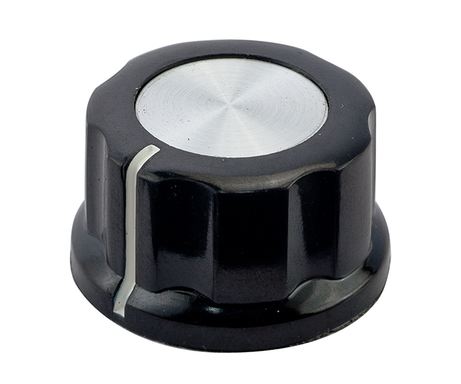 KNOB PLASTIC, SCREW FIXING, WITH WHITE LINE SILVER / ALUMINIUM TOP, FOR 6.4mm SHAFT , LxH = 26x16mm