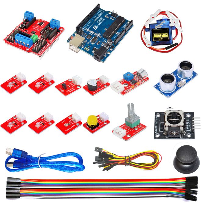 ARDUBLOCK GRAPHICAL PROGRAMMING LEARNING KIT FOR ARDUINO WITH SENSORS AND CONNECTING WIRES.