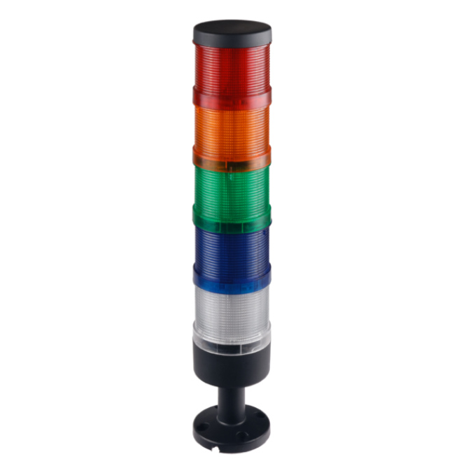 1 TO 5 WAY, FULLY CONFIGURABLE TOWER LIGHT 220VAC WITH YELLOW, GREEN AND RED LIGHTS (WHITE, BLUE AND BUZZER ARE OPTIONAL). CAN ADD UP TO 5 DEVICES. BLINKING OR STEADY.