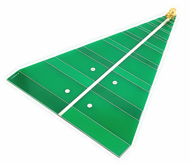 PC BOARD BASED, LOG PERIODIC ANTENNA / AERIAL, WITH SMA-J CONNECTOR FITTED. 740 - 6000 MHz, W=150 L=200mm,