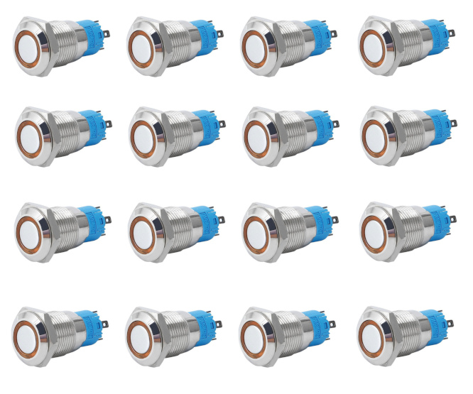 DOME HEAD STAINLESS STEEL VANDAL/WATERPROOF ROUND LATCHING, RING ILLUMINATED , 1xNORMALLY OPEN, 1xNORMALLY CLOSED, PUSH BUTTON SWITCH SCREW TERMINALS 5A/12VDC - 5A/250VAC, IP65, FITS PANEL HOLE OF 19mm, ORANGE, PRICED PER BOX OF 40 PIECES