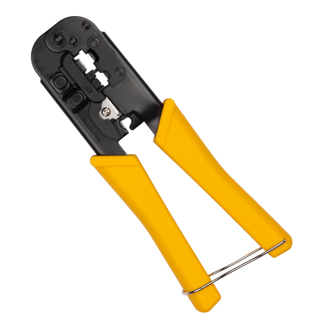 HAND HELD CRIMPING TOOL FOR MODULAR CONNECTORS, WITH RATCHET, STRIPS & CUTS RJ45, RJ12, RJ11, 8P8C, 6P6C, 6P4C, 4P4C, 4P2C.
