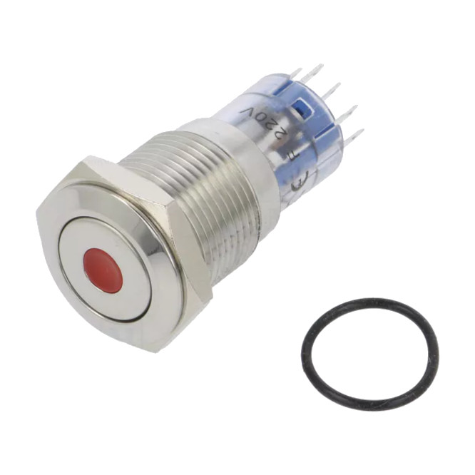 PUSH BUTTON SWITCH, ROUND, LATCHING, METAL, DOT ILLUMINATED (RED,220V), DPDT, 3A @ 250VAC, 16MM MOUNTING HOLE, IP, VANDAL